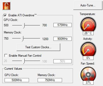 Возможности. Утилита позволяет изменять частоты GPU/Mem, имеет встроенный тест стабильности, осуществляет мониторинг за температурой и нагрузкой GPU, а также может следить за частотами работы карты в 2D/3D. В версии драйвера Catalyst 8.10 была реализована очень ценная поддержка управления скоростью вентилятора СО карты. Потолок установки частот GPU/Mem для видеокарты Radeon HD4830 составляет 700/2400.
