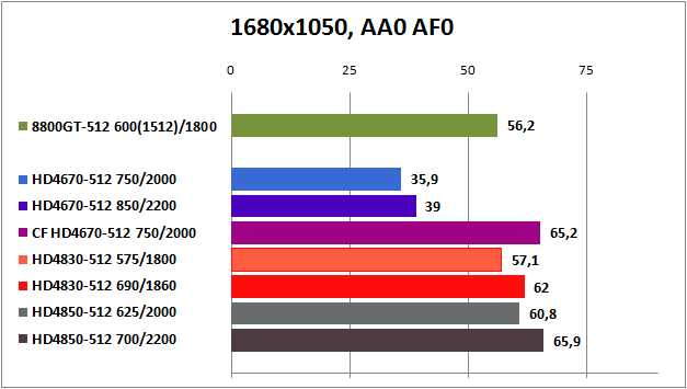 Игра СOD:MW остается за видеокартой Radeon HD4850. Radeon HD4830 и GeForce 8800GT показывают примерно равную производительность, за небольшим преимуществом продукта AMD.
