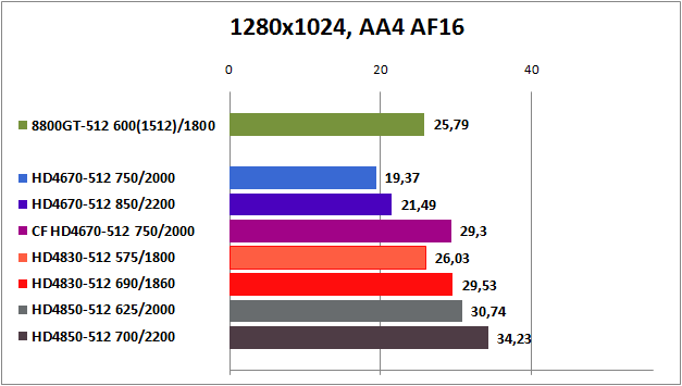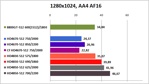 Видеокарты Radeon cерии HD4800 показывают великолепную производительность в "чистом" режиме, но все вместе терпят фиаско в "тяжелом" с применением АА4х и АF16x, проигрывая GeForce 8800GT.