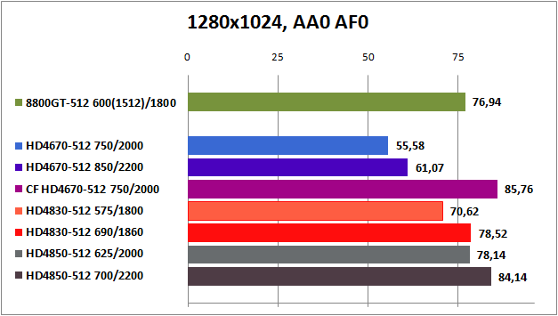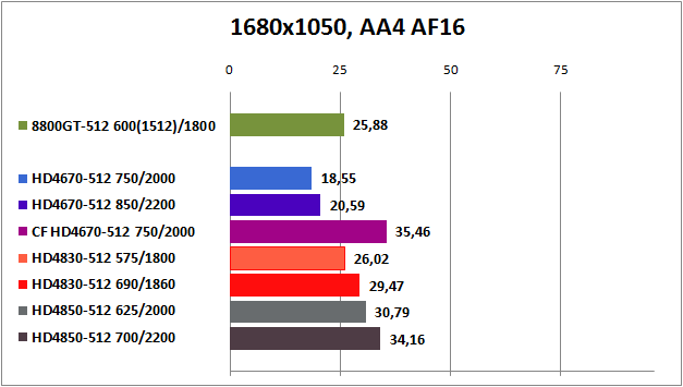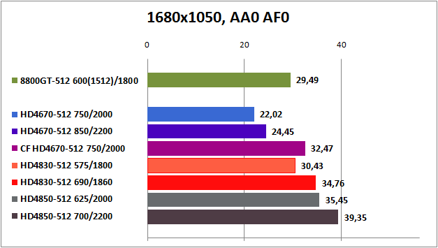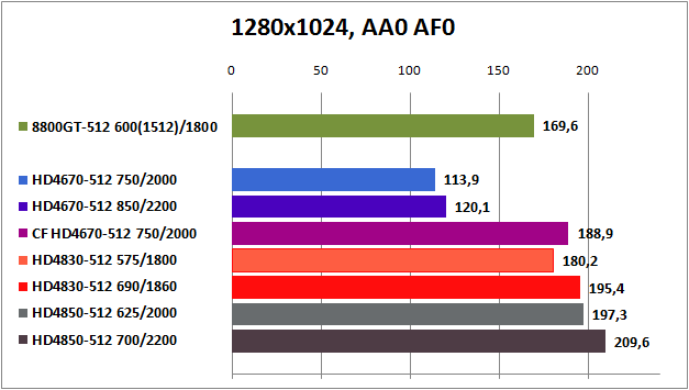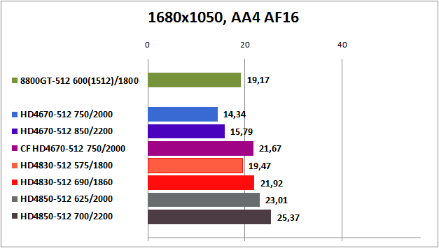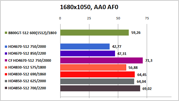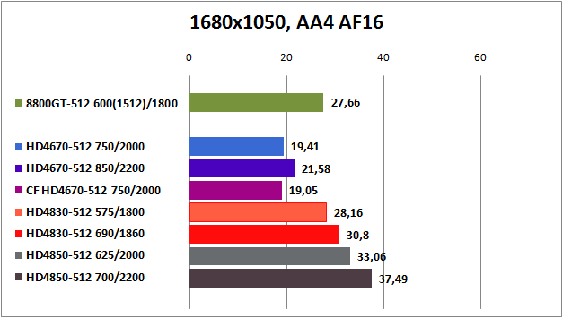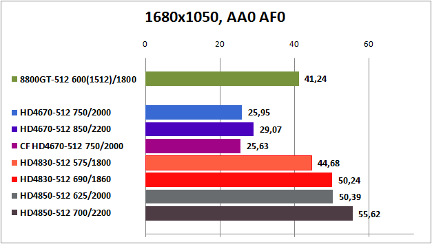 HD4850 вне конкуренции, а GeForce 8800GT и Radeon HD4830 идут на равных. Относительную играбельность эти видеокарты показываю лишь при настройках Medium и High до 1680x1050 без активации АА и AF. Маловато будет.