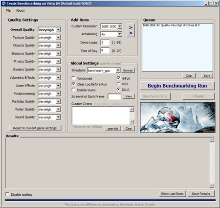 Конечно, я его не забыл. Но разве можно испытывать этой игрой разрешение Full HD? Да именно так. Не игру разрешением, а разрешение игрой. Crysis пока одна из тяжелейших игр, которая с трудом покоряется видеокартами. Поэтому во всех бенчмарках кризиса будет использовано разрешение 1680х1050 и АА х4. Ниже настройки бенчмарка: