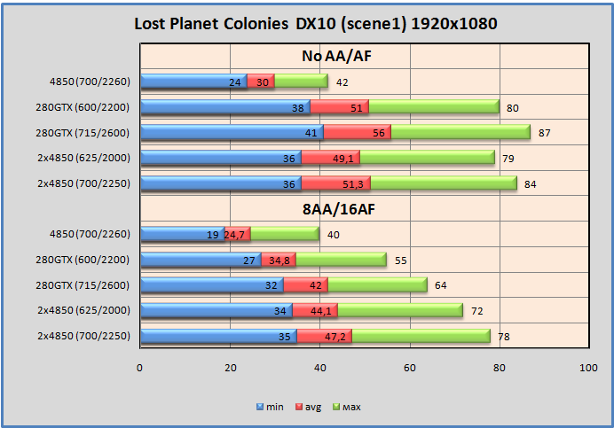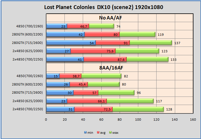 Бой был трудным. Опять же 280GTX no AA/AF на высоте. Тем не менее, CrossFire в тяжёлом режиме оказался быстрее. Одиночная 4850 с сегодняшним разгоном для этого не подходит.
