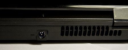 На задней панели ноутбука одиноко приютился разъём для 90-ваттного адаптера питания. Разместить его именно с этой стороны было правильным решением, так как в путешествиях провода, торчащие из разъёмов на задней панели, могут принести немало неудобства, а так производитель убил сразу двух зайцев, высвободив немного места сбоку и не помешав при этом пользователям, предпочитающим не иметь никаких разъёмов в задней части ноутбука. По соседству с ним раположились вентиляционные отверстия, через которые турбиной выводится горячий воздух. И это тоже правильное решение, так как мне уже попадались модели, дующие неприятно тёплым, почти горячим воздухом на руку, лежащую на мышке справа от корпуса лэптопа.