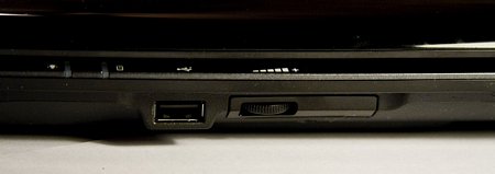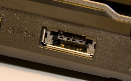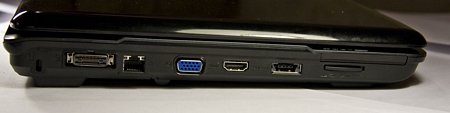 Слева расположились следующие порты: кардридер (SD/MMC/MS/MS PRO/xD), HDMI с поддержкой HDCP, VGA (d-sub), сетевой RJ-45, ExpressCard (54мм), разъём для репликатора портов Acer EasyPoint IV с четырьмя портами USB, DVI-D, VGA и разъемами аудио, позволяющего ещё сильнее расширить функционал системы, а также интересный своим конструктивом разъём, сочетающий в себе функции как USB, так и eSata. Конечно же, Kensington Lock тоже никуда не делся. Сказать по правде, ни разу им не пользовался, но кому-то он точно нужен :).