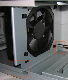 Отмечу, что корпус совместим с подавляющим большинством супер-кулеров, для примера в него запросто помещает Thermalright Ultra Extreme 120 и Scythe Ninja. Однако скобки, используемые для крепления вентиляторов, на первом из них располагаются практически вплотную к верхнему вытяжному вентилятору, что исключает демонтаж одной из них без снятия кулера (а, следовательно, и невозможность замены вентилятора). Это ограничение можно обойти, используя два вентилятора, а для их фиксации – резинки.