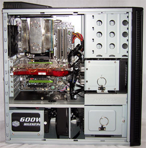 Таким образом, если вы внимательно читали приведенный выше текст, у Вас не должно возникнуть проблем с совместимостью. И не смотря на то, что данный корпус не принадлежит к стандарту Full-Tower, он сможет разметить вашу систему даже с парой мощных видеокарт, несколькими жесткими дисками и супер-кулером внушительных габаритов. Правда, при значительном весе самого корпуса и собранной в ней системы переносить такой блок даже по квартире будет затруднительно. Схватиться на нем особо не за что, если же обхватить корпус одной рукой сзади, а другой поднимать снизу за переднюю панель, то иногда возникает ощущение, что она вот-вот оторвется под тяжестью этого "холодильника".