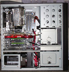 В качестве способа тестирования была выбрана максимальная поочередная нагрузка отдельных компонентов системы с фиксацией температур для каждого из них. Для процессора тестовым пакетом был выбран Linpack с облочкой LinX 0.5.0 (10 проходов, объем задачи 16134), 10 проходов было достаточно для снятия стабилизировавшихся температур. В качестве результата бралось среднее значение от температуры четырех ядер процессора, по показаниям SpeedFan 4.35. Для разогрева видеокарты использовался тест Furmark 1.4.0 в режиме теста на стабильность в течение 400 секунд – после чего происходило снятие температур по показаниям RivaTuner 2.11. На жесткие диски создавалась нагрузка при помощи программы Everest в режиме "Average Read Access" (в цикле). При тестировании шести жестких дисков WesternDigital Raptor 150GB 10.000rpm установленных в Raid 0 их температуры фиксировались при помощи термопары, приклеенной к их корпусу куском скотча (только для одного из жестких дисков в каждой из корзин).