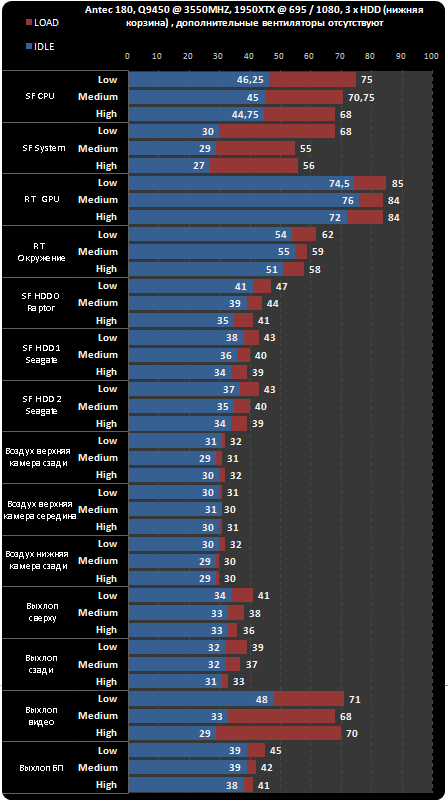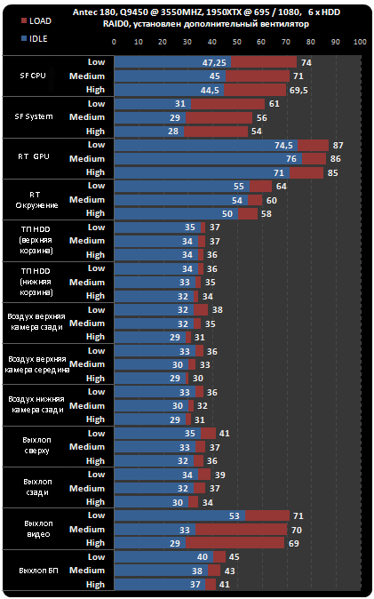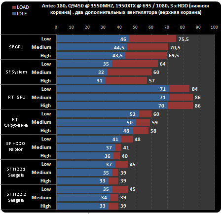 Перейдем к оставшейся части тестов с тремя жесткими дисками (замер температур на выхлопах для второй части тестов не производился ввиду малой информативности):