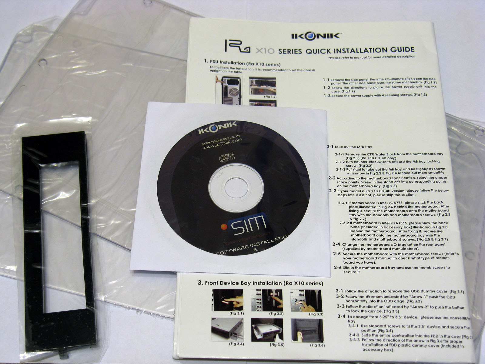 Помимо корпуса, в коробке можно обнаружить инструкцию на тех же 8 языках, заглушку для установки 3,5”-устройства в отсек 5,25”, два оргстекла для установки в боковую стенку вместо решёток, а так же диск с ПО. Внутри корпуса в 3,5” отсеке находится коробка с запчастями и фирменной тряпочкой :).
