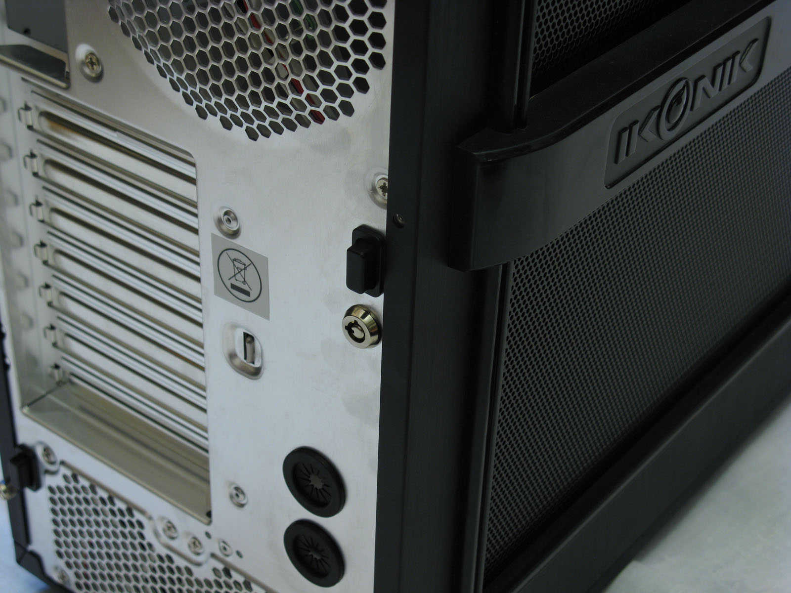 Имеется возможность закрывать боковые стенки корпуса на ключ, чтобы посторонние не имели доступа внутрь. И в самом деле, нечего посторонним ковыряться в компьютере оверклокера! Еще одной особенностью является наличие замков с кнопками, на которые надо нажать для того, чтобы иметь возможность снять стенку корпуса.