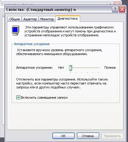 - Сдвигаем бегунок «Аппаратное ускорение» до конца влево (делает передвижение окон плавными как при установленных драйверах на видеокарту)