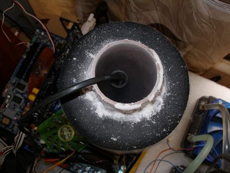 - Производительность, достаточная для разгона современных процессоров. Бесспорно, стакан уступает моделям, выточенным из цельного куска меди, но для первых шагов в экстремальном разгоне его более чем достаточно. С четырёхъядерными процессорами придется сложновато, скачки температуры будут больше, и следить за температурой надо будет ещё внимательнее.