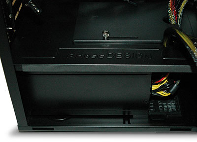С блоком питания все значительно проще. Замена корзины для жестких дисков (в P180) на пару отсеков для 5”-устройств (в Mini P180) в передней части нижнего отсека избавила от необходимости продувать его целиком, а, значит, и от расположенного в центре этого отсека вентилятора. Если кому интересно мое мнение, то это решение в P180 кроме очевидных минусов в виде ограничения совместимости с блоками питания по длине и просто увеличения количества движущихся деталей, а, значит, и общего уровня шума/вибраций, было еще и просто искусственным; даже, если хотите, недостойным общего инженерного уровня Antec. Но довольно про P180. У Mini P180 нет ограничений на длину блока питания. Так, тестовый Antec Signature 850W имеет длину 18см, и, как видно на фотографии, устанавливается с большим запасом. Уверен, проблем не будет и с полуторакиловаттными монстрами в 22-24см длиной.