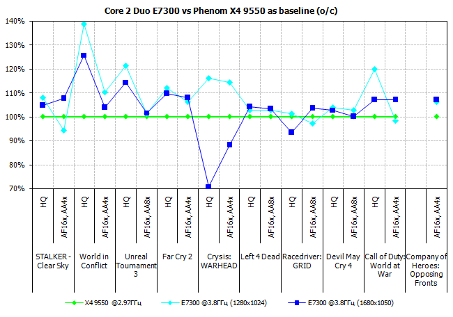 3.8 ГГц тактовой частоты – и проблемы с кэшем отходят на второй план. «Не поддаётся» только Crysis, но вряд ли это может служить большим утешением для поклонников AMD – мы помним, что абсолютные цифры в высоком разрешении были весьма невысоки.