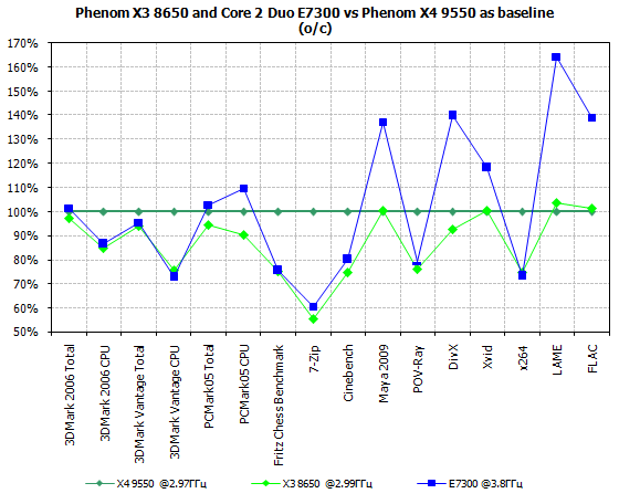 Процессоры Phenom оставили о себе неоднозначное впечатление. X3 8650 не может похвастаться большой производительностью ни в многопоточных приложениях (где три ядра не всегда могут компенсировать недостаток частоты относительно двухъядерных конкурентов от Intel), ни в однопоточных (здесь дают о себе знать ограниченные возможности самого ядра). Поскольку разгон не выявил преимущества X3 в разгонном потенциале, единственным «плюсом» этого процессора перед X4 9550 является более скромный уровень тепловыделения. Впрочем, этот уровень всё равно не идёт ни в какое сравнение с показателями E7300.