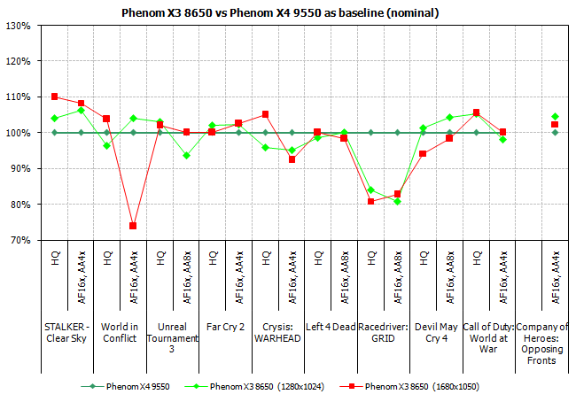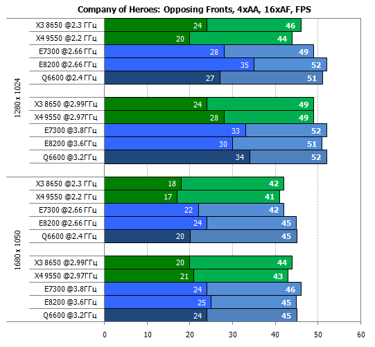 В новейшем шутере на старую тему в стандартном режиме графики правят бал процессоры Core, при этом E7300 может конкурировать с E8200 только после разгона. Трехъядерник от AMD обходит X4 9550 во всех режимах в строгом соответствии с разницей в тактовых частотах, но и он лишь однажды дотягивается до уровня слабейшего из процессоров Intel.