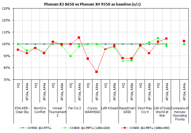 После разгона редкие светлые пятна на производительности X3 8650 меркнут окончательно. Вывод однозначен – с точки зрения производительности в играх X4 9550 предпочтительнее.