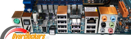 Шесть портов расположены параллельно плате, а другие два — перпендикулярно, при установке двухслотовых видеокарт эти порты будут блокироваться. Задняя панель платы выглядит следующим образом: