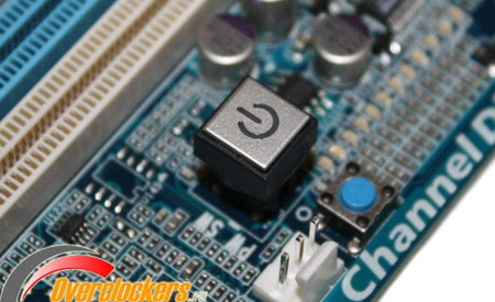 Здесь имеется восемь портов USB2.0, порт FireWire, порты клавиатуры и мыши, восемь аудиоразъемов и цифровой выход, а также кнопка обнуления CMOS. На материнской плате присутствует только одна кнопка – Power, которая находится рядом со слотами оперативной памяти: