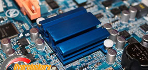 С одной стороны такое расположение удобно — при установке видеокарты в третий слот PCI-Express x16 кнопка была бы недоступна, но с другой стороны неудобно — обычно в этом «районе» довольно большое количество проводов, что может затруднить доступ к кнопке. Система охлаждения материнской платы выглядит следующим образом: