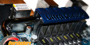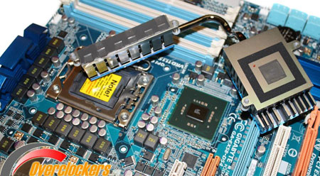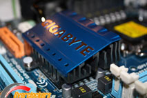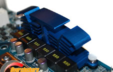 Система охлаждения, по сравнению с топовым решением Gigabyte, сильно упрощена, радиатор южного моста не соединен тепловыми трубками с северным мостом. Температура IOH в разгоне составила приблизительно 64-65 градусов, не многовато ли? Я решил демонтировать систему охлаждения материнской платы и увидел следующие: