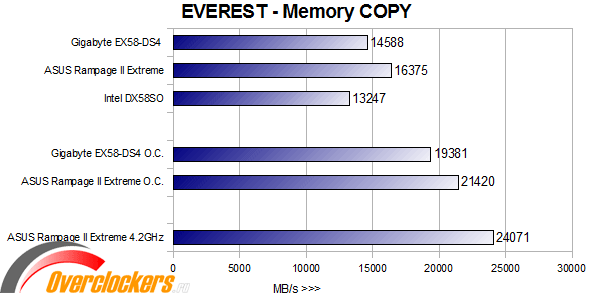 Здесь, за счет большей частоты памяти, ASUS Rampage II Extreme оказывается далеко впереди, но материнская плата Gigabyte EX58-DS4 обходит более дорогую Intel DX58SO, преимущество незначительное, но оно есть. В разгоне материнских плат до предела Gigabyte EX58-DS4 материнская плата ASUS опять оказывается впереди, но разница здесь совсем незначительна, всего лишь ~1000MB/s.