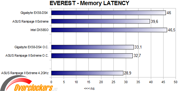 Материнская плата ASUS Rampage II Extreme, благодаря большей частоте памяти, показывает меньшие задержки, но на равных с Intel DX58SO материнская плата Gigabyte оказывает быстрее, опять же, при меньшей стоимости. В разгоне до равных частот ASUS Rampage II Extreme показывает немного лучшие результаты, но разница довольно невелика.