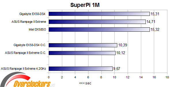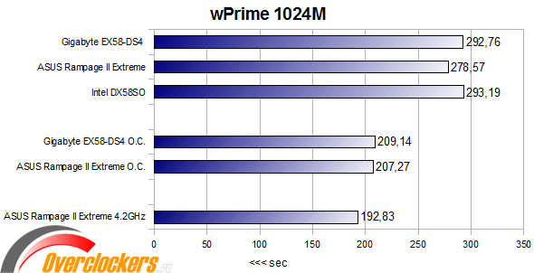 Gigabyte EX58-DS4 оказывается быстрее материнской платы Intel DX58SO, но ASUS Rampage II Extreme оказывается относительно далеко впереди за счет большей частоты памяти. В разгоне до равных частот материнская плата Gigabyte не догоняет Rampage II Extreme, но вновь показывает довольно неплохие результаты скорости.