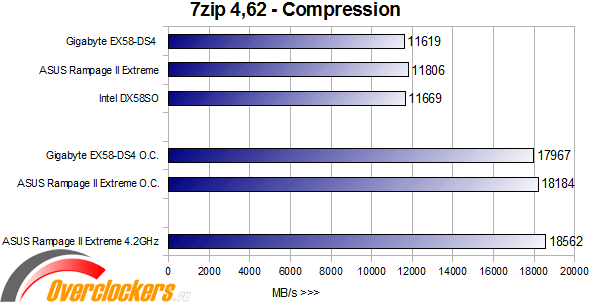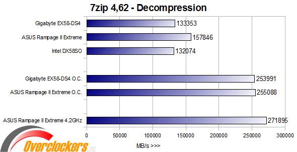 Здесь все три материнские платы держатся приблизительно на одном уровне, но небольшое преимущество ASUS Rampage II Extreme все же есть, но в разгоне до равных частот скорости материнских плат Gigabyte EX58-DS4 и ASUS Rampage II Extreme практически равны, разница всего лишь ~200MB/s. Посмотрим на результаты тестирования распаковки: