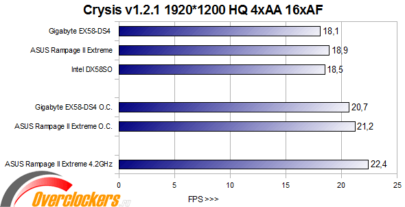 Эта игра более процессорозависима, чем Crysis, и здесь хорошо видно преимущество разогнанных процессоров над теми, что работают в номинале. Здесь материнская плата практически «наступает на пятки» материнской плате ASUS Rampage II Extreme, обгоняя более дорогую Intel DX58SO, в разгоне до предела обеих плат картина сохраняется — небольшое отставание материнской платы Gigabyte EX58-DS4, но оно очень незначительно.
