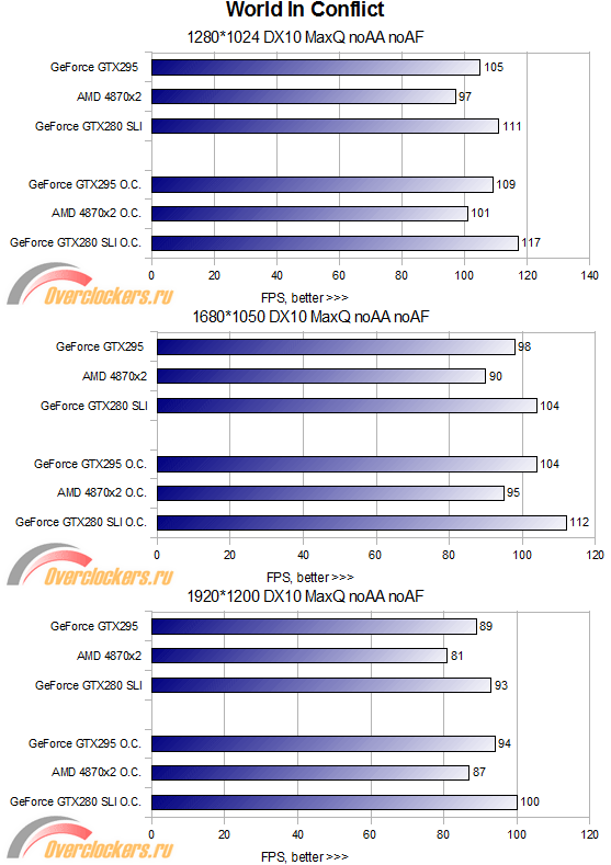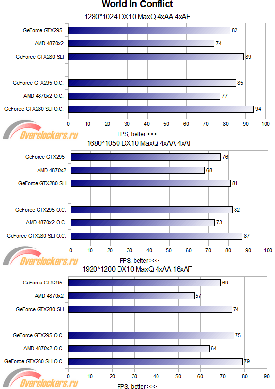 Здесь превосходство GTX295 над конкурентом увеличивается, особенно в разрешении 1920*1200 — разница составляет 12 FPS, разгон немного сокращает отставание, но все равно GTX295 не оставляет 4870x2 никаких шансов. При тестировании всех видеокарт не наблюдалось никаких, даже малейших, рывков и подвисаний — в этой игре и CrossFire, и SLI работают довольно неплохо. Отставание AMD, в принципе, можно списать на более слабый чип, а не на плохую работу Multi-GPU технологии.
