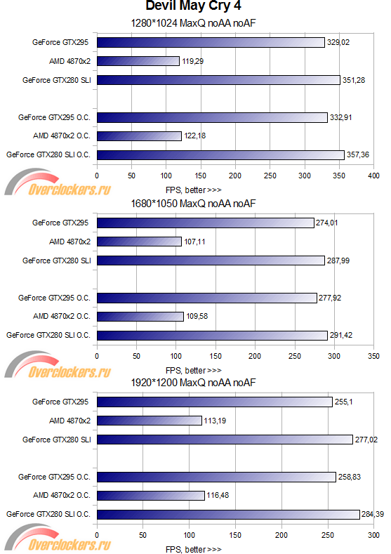 Со включенным сглаживанием видеокарта AMD 4870x2 чувствует себя как будто лучше — в 1280*1024 и 1600*1200 результаты только улучшились, а в 1920*1200 потери скорости совсем небольшие. С GTX295 немного другая ситуация — её отставание от связки из двух GTX280 становится больше, а разгон практически не дает прибавки скорости.