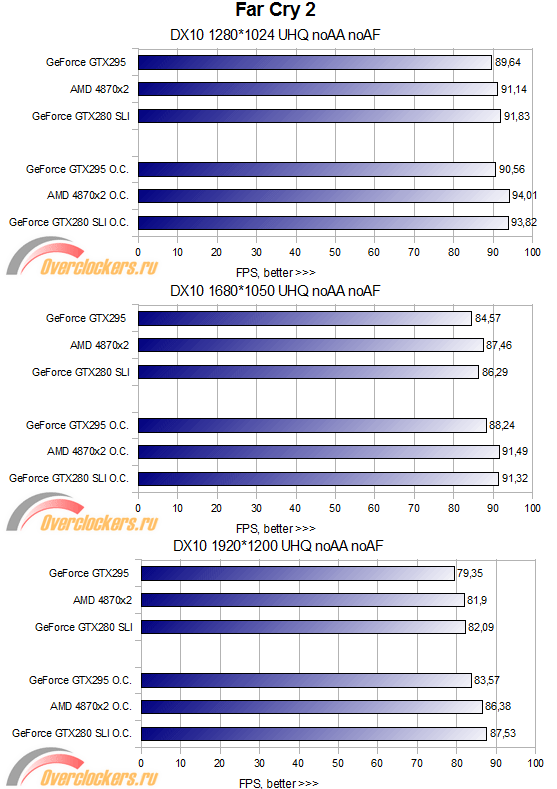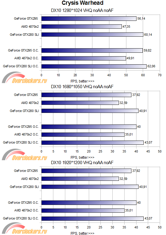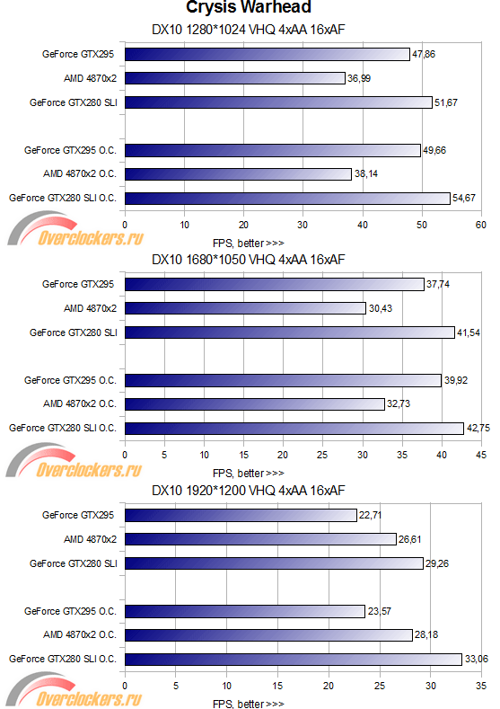 Здесь наблюдается более интересная картина — видеокарта GTX295 оказывается быстрее в разрешениях 1280*1024 и 1680*1050, но в 1920*1200 наблюдается значительный провал производительности, и противостоять здесь видеокарте AMD 4870x2 может только связка из двух GTX280. Разгон видеокарты GTX295 почти ни к чему не приводит — производительность практически не растет, здесь, похоже, «поработала» урезанная видеопамять. А вот разгон видеокарты AMD 4870x2 позволяет ей практически догнать не разогнанную связку из двух видеокарт GTX280! Во время тестирования были замечены значительные провалы FPS у видеокарты GTX295 — частота кадров местами колебалась как 8...61, тогда как даже у 4870x2 не было замечено провалов хуже, чем 17...48. Согласитесь, разница очень значительная.