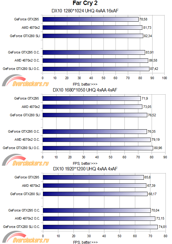 Имеются некоторые проблемы с драйверами - наблюдаются довольно частые провалы FPS. Да, у видеокарты AMD 4870x2 тоже бывают значительные провалы, но на качество игры они никак не влияют, совершенно другая ситуация с видеокартой GTX295 — провалы FPS заметны не только по мониторингу частоты кадров, но и на глаз — особенно они замены в Far Cry 2.