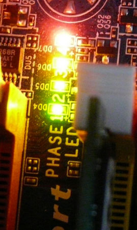 Между слотами памяти расположены индикаторы работы фирменной системы энергосбережения Dynamic Energy Saver. При работе данной технологии два из четырех имеют зеленый цвет, а остальные желтый и красный. Индикаторы отражают количество активных фаз в данный момент. О работе данной технологии будет рассказано ниже.