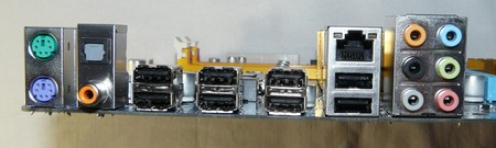 На задней панели, как отмечалось выше, расположены восемь портов USB2.0. Кроме них присутствуют стандартные для материнских плат такого уровня разъемы PS/2 для клавиатуры и мыши, а также шесть аудио-коннекторов. В дополнение к ним присутствует коаксиальный и оптический звуковой выход.