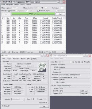 К сожалению, при разгоне выше чем 4500MHz требовалось напряжение свыше 1.4В, что приводило к его перегреву и как следствие – к потере стабильности. Нагрев – 62 градуса.