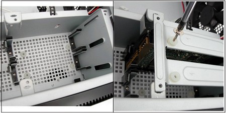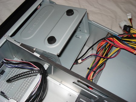 В передней части отсека располагается корзина для дисководов. Ее устройство достаточно оригинально – корзина может быть легко извлечена из корпуса, для этого достаточно всего лишь потянуть рукой за ее заднюю часть. Передвигаясь по специальной направляющей корзина «выскользнет» вверх. Однако, в нижнем положении она зафиксирована достаточно плотно, кроме того в собранном положении корзина соприкасается с корпусом только специальными резиновыми ножками, что должно уменьшить передачу вибраций.