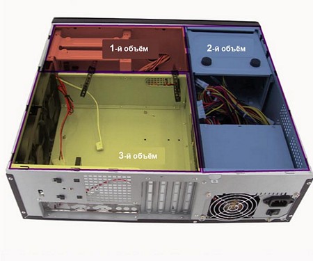 Приведем фото с официального сайта, на нем разными цветами выделены разные «объемы корпуса» - производитель постарался максимально «герметично» отделить их друг от друга. Основная цель подобной компоновки – разнести горячие компоненты системы «по разным углам», не позволяя им дополнительно подогревать друг друга и мешать доступу воздуха в наиболее проблемные зоны.