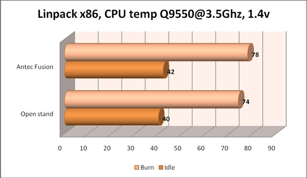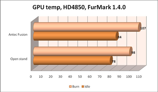 В целом результаты тестирования можно признать хорошими, однако, на мой взгляд, бросается в глаза то, что в корпусе сделан акцент на охлаждении центрального процессора. Два 120-мм вентилятора, расположенных в непосредственной близости от кулера ЦПУ, обеспечивают очень достойный температурный режим последнего, практически вровень с открытым стендом.