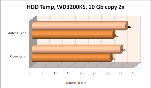 Мой HDD в процессе предыдущих тестов показал себя совсем не горячим. Так что и здесь ситуация не особенно меняется. Небольшой прогрев жесткого диска можно считать приемлемым. Однако при использовании более вместительных жестких дисков, особенно в паре, данный отсек корпуса потребует доработки.