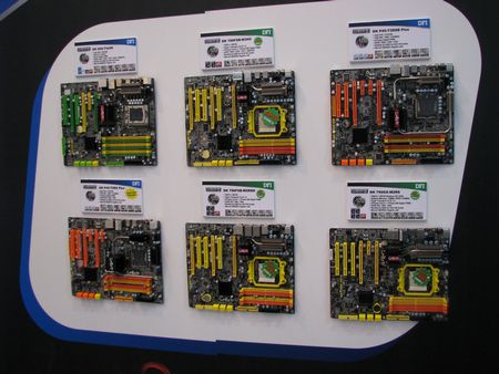 Помимо плат для платформ Intel, компания DFI представила плату серии DK для процессоров AMD Phenom II X3/X4 под названием DFI Lanparty DK 790FXB-M3H5 c поддержкой памяти DDR3 с частотой вплоть до 1600МГц. Плата оснащена тремя слотами PCI, тремя PCI Express 2.0 x16, шестью SATA-II разъёмами, одним IDE каналом, индикатором POST-кодов, четырьмя слотами для оперативной памяти DDR3, четырехфазной системой питания процессора и однофазной цифровой системой питания северного моста. На задней панели расположен гигабитный интерфейс RJ45 на контроллере Marvell 88E8056, шесть интерфейсов USB 2.0, ещё шесть распаяны на плате. К сожалению, на официальном сайте на данный момент отсутствует какая либо информация об этой плате, поэтому я не могу поведать вам о режимах работы видеокарт в тандеме Crossfire X, но я могу с уверенностью сказать, что такая поддержка имеется и скорее всего будет реализована в режиме х8/х8. Фотография материнской платы DK 790FXB-M3H5 (верхний ряд, по центру) и ещё двух всем давно известных плат серии Lanparty DK для процессоров AM2+/AM3 DFI DK 790FXB-M2RSH (нижний ряд, по центру), и DFI DK 790GX-M2RS (нижний ряд, справа) расположена ниже: