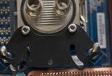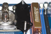 Для проведения тестирования была выбрана материнская плата Abit Quad-GT. Целью была проверка совместимости креплений водоблока с материнскими платами, имеющими массу радиаторов на околосокетном пространстве. Удивительно, но факт – водоблок оказалось возможно установить в любом из двух положений, зазор до радиаторов в обоих случаях не превышал одного (!) миллиметра. Ювелирный расчёт! :)