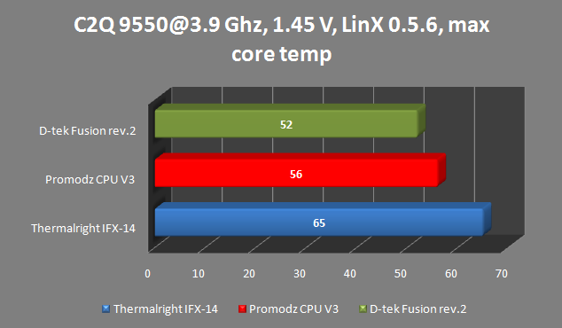 Более правдивым было сравнение на Q9550, хотя и здесь не получилась полная картина: на максимальной частоте этого процессора можно долго гонять LinPack даже с воздушным охлаждением, поэтому сравнение максимумов стабильного разгона с разными водоблоками не состоялось. Зато в качестве бонуса имеем температуры под LinX при охлаждении не только двумя водоблоками, но и Thermalright IFX 14. Комнатная температура, разумеется, была во время проведения тестов неизменной и составляла 22°С. Проводилось 2 сеанса по 20 проходов c объёмом используемой памяти 2048 Мб.