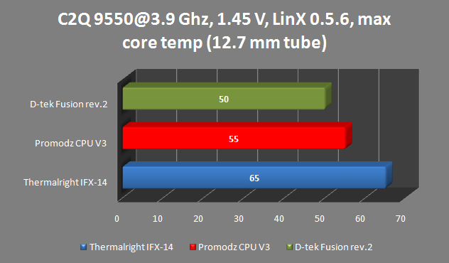 Как видим, СВО от ProModz ушла в серьёзный отрыв от одного из лучших кулеров современности, а с заменой водоблока на D-TEK температура ядер Q9550 снизилась ещё на 4°, что при учёте в целом низкого уровня температур является разницей существенной, но не катастрофической. Насколько я знаю, свою эффективность D-Tek раскрывает при высокой скорости потока. Чтобы выяснить, не сказался ли на результатах тестов относительно малый диаметр шлангов, я снабдил систему шлангом Tygon R3603 15,9/12,7мм.