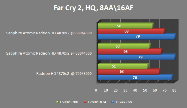 Sapphire 4870x2 Atomic – красивый и практичный продукт. Такое получается редко: обычно компании, полагаясь на силу маркетинга, обходятся примитивными доработками: перекрашивание системы охлаждения карты, поднятие частот на пару-тройку десятков мегагерц и все. Здесь же, помимо внешней привлекательности, есть выгода практическая: приобретая Atomic, пользователь сразу же получает готовую систему водяного охлаждения, которую можно «нагрузить» и видеокартой, и процессором. Естественно, просто так ничего не дается, и для нормального функционирования надо позаботиться о хорошей вентиляции корпуса.