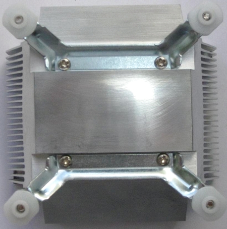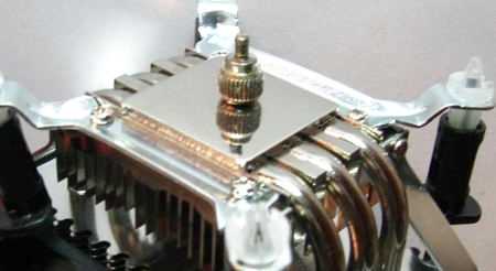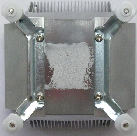 Основание кулера круглой формы имеет диаметр 28 мм и не перекрывает всей площади теплораспределительной крышки процессоров в исполнении LGA775. Однако площади основания вполне хватает, чтобы закрыть самую термически напряженную зону контакта ядер процессора с крышкой.