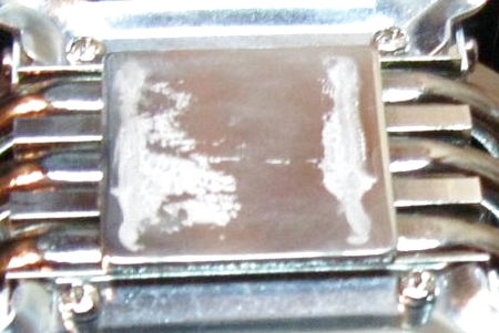 Тепловые трубки сплющены в области контакта с основанием до овального сечения, что позволяет увеличить площадь соприкосновения. Крепление трубок осуществляется пайкой. Сама подошва представляет собой медную пластину, покрытую тонким слоем никельсодержащего сплава для предотвращения окисления. Однако при снятии отпечатка выяснилось, что под внешней полировкой скрывается очень грубая форма самого теплосъемника. При установке на процессор, покрытый тонким слоем термопасты, был получен вот такой отпечаток: