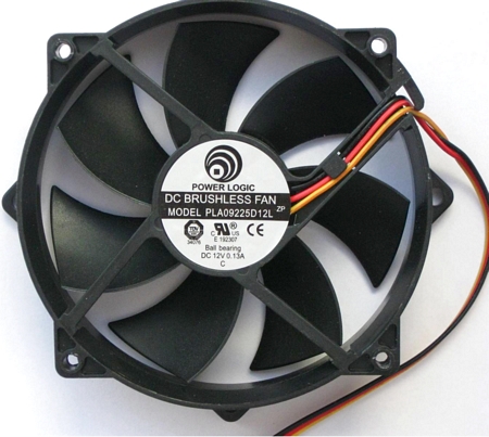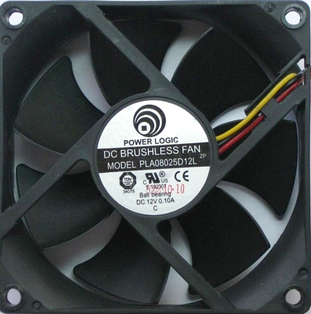 Вентилятор имеет скорость вращения крыльчатки 2000 об/мин и обеспечивает поток воздуха в 26 CFM при уровне шума не более 20 дБ.