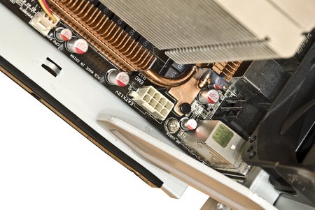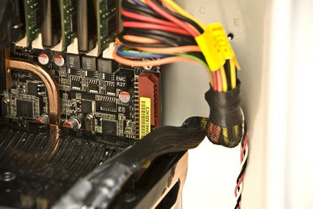 Разъем силового питания процессора перекрывается усилителем с одной стороны, а радиатор системы охлаждения мешает с другой стороны. Поэтому будьте осторожны, берегите пальцы, подключая разъем.